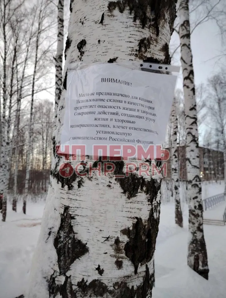 В парке имени Чехова в Перми повесили объявление об опасности катания со склона. Стихийную горку посыпали песком и огородили сигнальной лентой. Фото горожане поделились в telegram-канале «Пермь ЧП и ДТП».