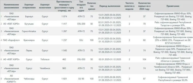 Список субсидированных рейсов из Сургута в 2025 году