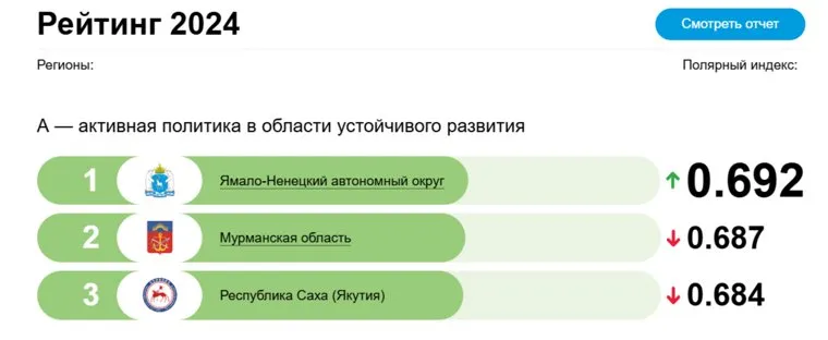 «Лидерами рейтинга „Полярный индекс. Регионы“ 2024 года стали Ямало-Ненецкий автономный округ, Мурманская область и Республика Саха (Якутия)», — сообщается в рейтинге. Ямал продемонстрировал рост по всем объективным показателям, получив рейтинг A, означающий активную политику в области устойчивого развития.