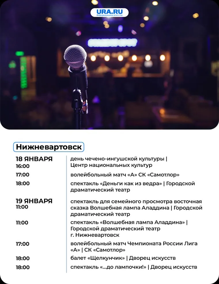 Вартовчан ждут выходные с уклоном в культуру. В городском драмтеатре и во дворце искусств зрители увидят сразу несколько постановок, среди которых спектакль «Волшебная лампа Алладина». День чечено-ингушкой культуры пройдет в Центре национальных культур — гостей ждет дегустация блюд национальной кухни и концерт. А спортивных югорчан зовут на волейбольный тур чемпионата России. Команда «Югра-Самотлор» на своей площадке примет челябинское «Динамо».