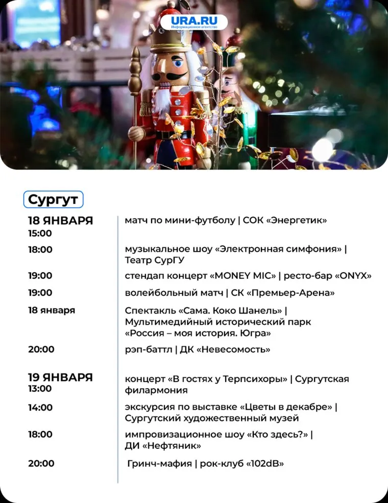 В Сургуте рок-клуб «102dB» устроит игру в мафию, в которой нужно будет вычислить «Гринча». Игрокам обещают подарить небольшие презенты. А любителей зрелищных шоу приглашают на рэп-баттл в дом культуры «Невесомость». Соревноваться в текстовой схватке будут местные музыканты. Городской драмтеатр тем временем покажет зрителям спектакль «Сама. Коко Шанель». На этот раз артисты выступят в мультимедийном историческом парке «Россия — моя история». Смешить сургутян будут комики Высшей лиги КВН во дворце искусств «Нефтяник». На сцену выйдут юмористы команды «Северяне» Анатолий Березкин и Кирилл Скворцов.