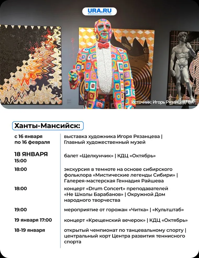 Ценителей искусства ждут на выставке тюменского живописца Игоря Рязанцева, картины которого выставили в Государственном художественном музее в Ханты-Мансийске. Творец под псевдонимом Рене Реза попал в Книгу рекордов Гиннеса как единственный в мире художник-филумист. Вместо кистей он использует шприцы с акриловой краской. А на сцене КДЦ «Октябрь» с балетом выступят артисты из Москвы. На этой же концертной площадке юных хантымансийцев развлекут программой «Крещенские забавы» — ребятам расскажут про обряды и народные традиции.