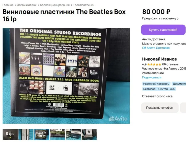 «На сайте представлен широкий выбор товаров, связанных с творчеством The Beatles. Самый дорогой лот подборки — коллекция из 16 виниловых пластинок с музыкой группы — продается в Челябинске за 80 тысяч рублей. Бокс-сет был выпущен в 2012 году, в него вошли все номерные студийные альбомы, выходившие с 1963 по 1970 год», — сообщили в «Авито».