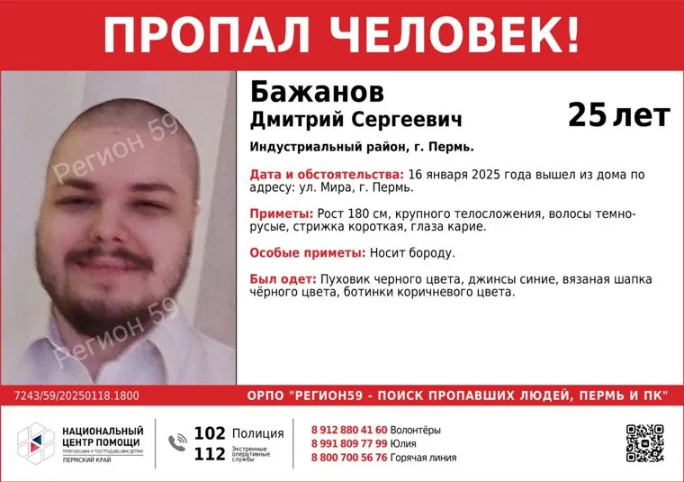 «Устанавливается местоположение Дмитрия Бажанова, 25 лет. Он 16 января 2025 года вышел из дома по улице Мира в Перми. С тех пор его местонахождение неизвестно», — написано в telegram-канале поисковиков.