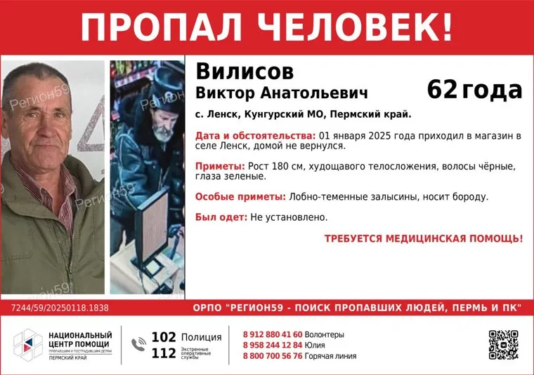 «Устанавливается местонахождение Виктора Вилисова, 62 года. Он 1 января 2025 года приходил в магазин в селе Ленск, домой не вернулся. С тех пор его местонахождение неизвестно», — написано в telegram-канале отряда.