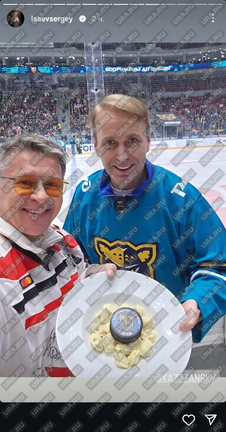 «Вот и свершилось то, о чем говорили самые красивые женщины. Два самых красивых мужчины выйдут сегодня на лед. Так что, друзья, будет горячо», — сказал Исаев на видео, опубликованном в Instagram (принадлежит компании Meta, которая признана в РФ экстремистской и запрещенной организацией). На льду комик устроил перформанс, выйдя с тарелкой и блестящей крышкой на ней. Под колпаком лежали пельмени, на которых была шайба.