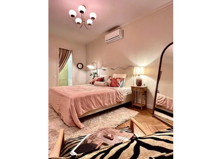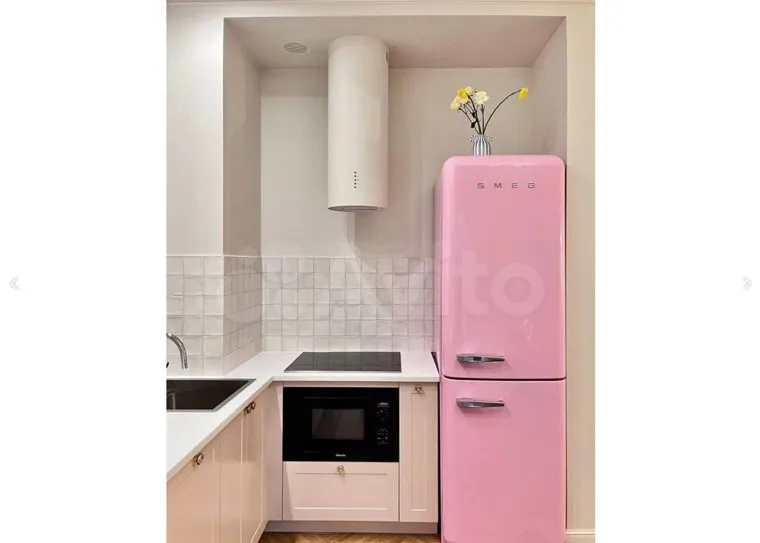 На фотографиях видно, что квартира состоит из кухни-гостиной и спальни. В кухне стоит холодильник ярко-розового цвета, а в гардеробной — шкафы. Спальня украшена светло-розовым текстилем. Квартиру предлагают не только купить, но и арендовать. За месяц проживания придется заплатить 110 тысяч рублей.