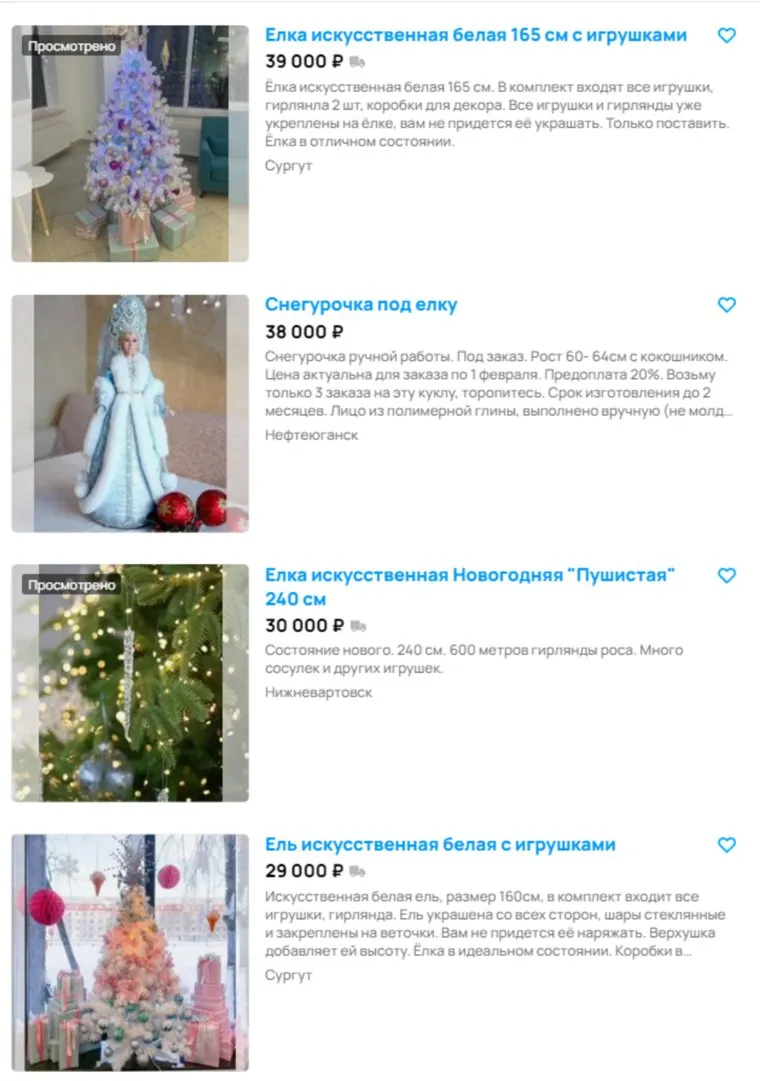 За последнюю пару недель на сервисах онлайн-объявлений в ХМАО появились десятки публикаций о продаже елок в комплекте с игрушками, гирляндами и другими аксессуарами. Продавцы отмечают, что деревья использовались всего лишь раз. «Все игрушки и гирлянды уже закреплены на елке, вам не придется ее украшать», — следует из описания товара, который продавец оценил почти в 40 тысяч рублей.