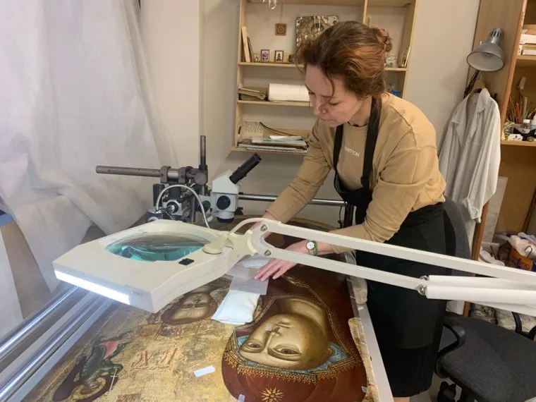 Маргарита Карпухина работает с иконой «Богоматерь Одигитрия»