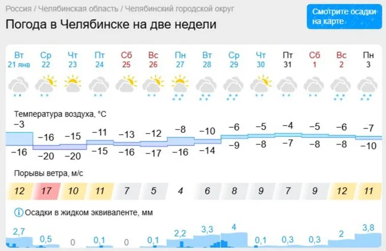 Как URA.RU писало ранее, в ночные часы 22 и 23 января челябинцам пообещали снижение температуры до минус 22 градусов. Синоптики также прогнозируют усиление ветра до 11 метров в секунду.