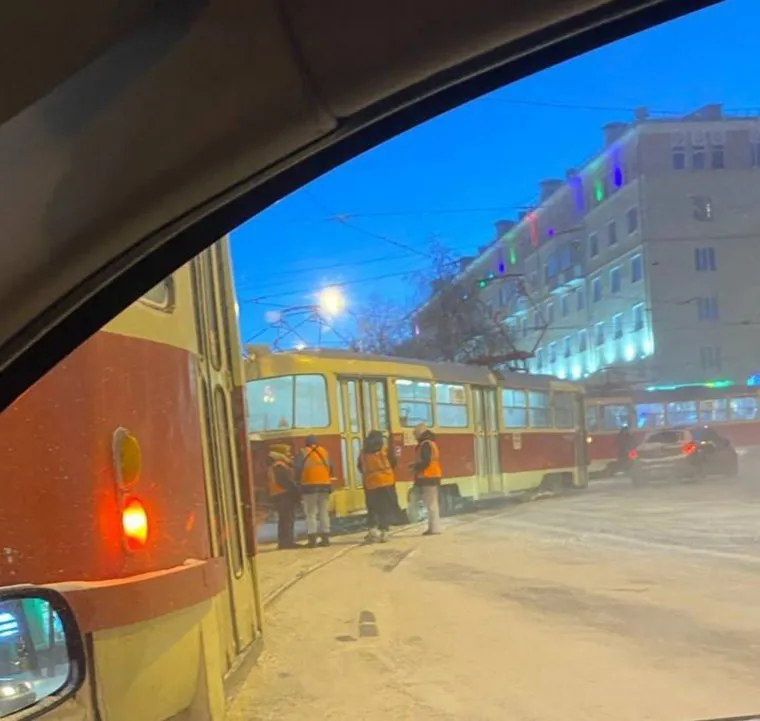 Трамвай с пассажирами сошел с рельсов возле УрФУ, движение встало. Фото