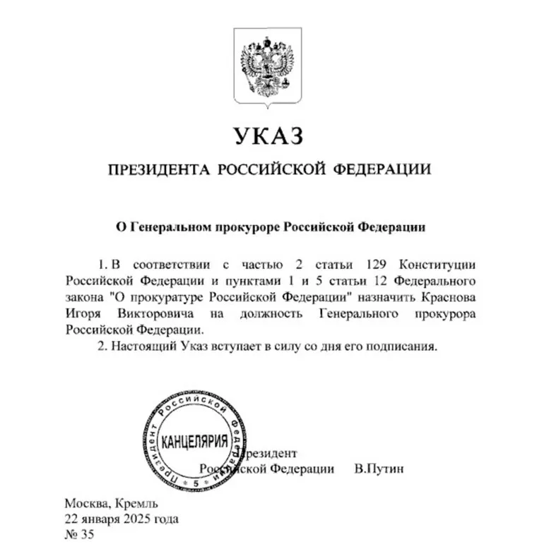 «Назначить Краснова Игоря Викторовича на должность генерального прокурора Российской Федерации», — сказано в документе. Указ вступает в силу со дня подписания.