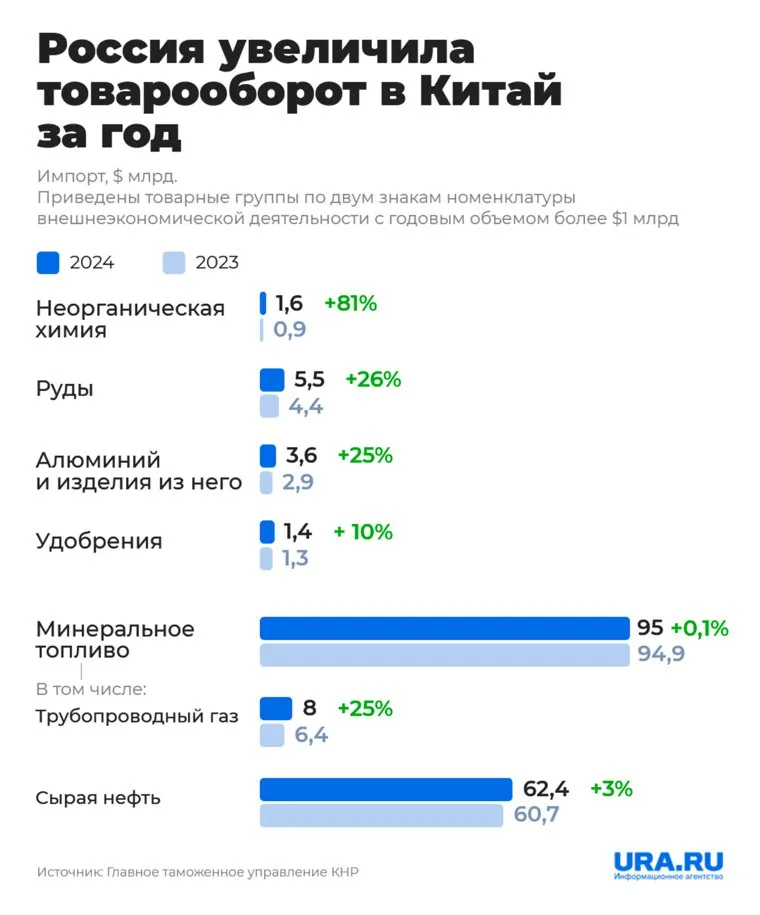 В 2024 году товарооборот между Китаем и Россией достиг нового рекордного уровня, составив 245 миллиардов долларов. При этом объем российских экспортных поставок в КНР сохранялся на отметке в 129 миллиардов долларов. Особенно заметен рост экспорта медного концентрата, природного газа и ядерного топлива. Эти изменения вызваны рядом факторов, включая колебания мировых цен и введение антироссийских санкций, сообщает РБК со ссылкой на экспертов. Как выглядел товарооборот России и Китая в прошлом году — в материале URA.RU.
