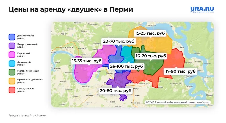 «Стоимость аренды двухкомнатной квартиры в Орджоникидзевском районе Перми от 15 тысяч до 25 тысяч рублей в месяц. В Кировском районе — от 15 тысяч до 35 тысяч рублей. В Мотовилихинском районе — от 16 тысяч до 70 тысяч рублей», — сказано на сайте объявлений.