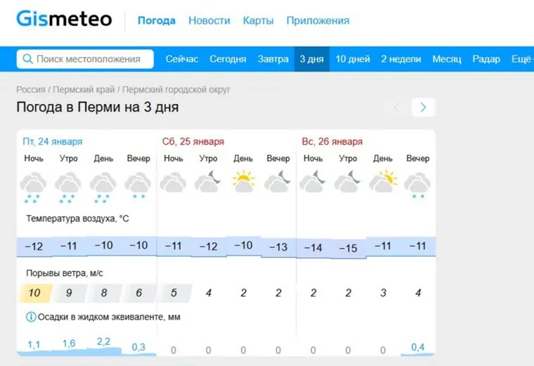 В ближайшие выходные, 25 и 26 января, пермяков ожидает умеренная погода без сильного снегопада. Прогноз на ближайшие двое суток дает метеорологический ресурс Gismeteo.