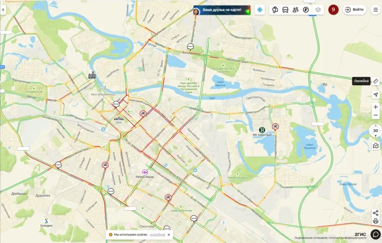Пробки в Тюмени на вечер 24 января оцениваются на девять баллов из десяти. Такие данные опубликованы на сервисе 2ГИС.