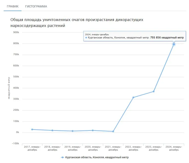 В 2024 году в Курганской области было уничтожено почти 800 тысяч квадратных метров очагов произрастания дикой конопли. Это рекордный показатель с 2017 года. Такие данные приводит МВД России на сайте государственной статистики.