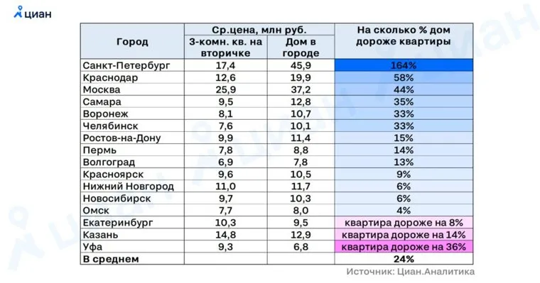 Как отмечается на сайте, в Санкт-Петербурге коттеджи стоят в 2,5 раза дороже, чем трехкомнатное жилье на вторичке, в Краснодаре — в 1,5 раза, в Новой Москве — в 1,4 раза. Также минимальную разницу в стоимости можно наблюдать в Омске, Новосибирске и Нижнем Новгороде. А в Екатеринбурге, Казани и Уфе коттедж стоит даже меньше, чем готовая трехкомнатная квартира.
