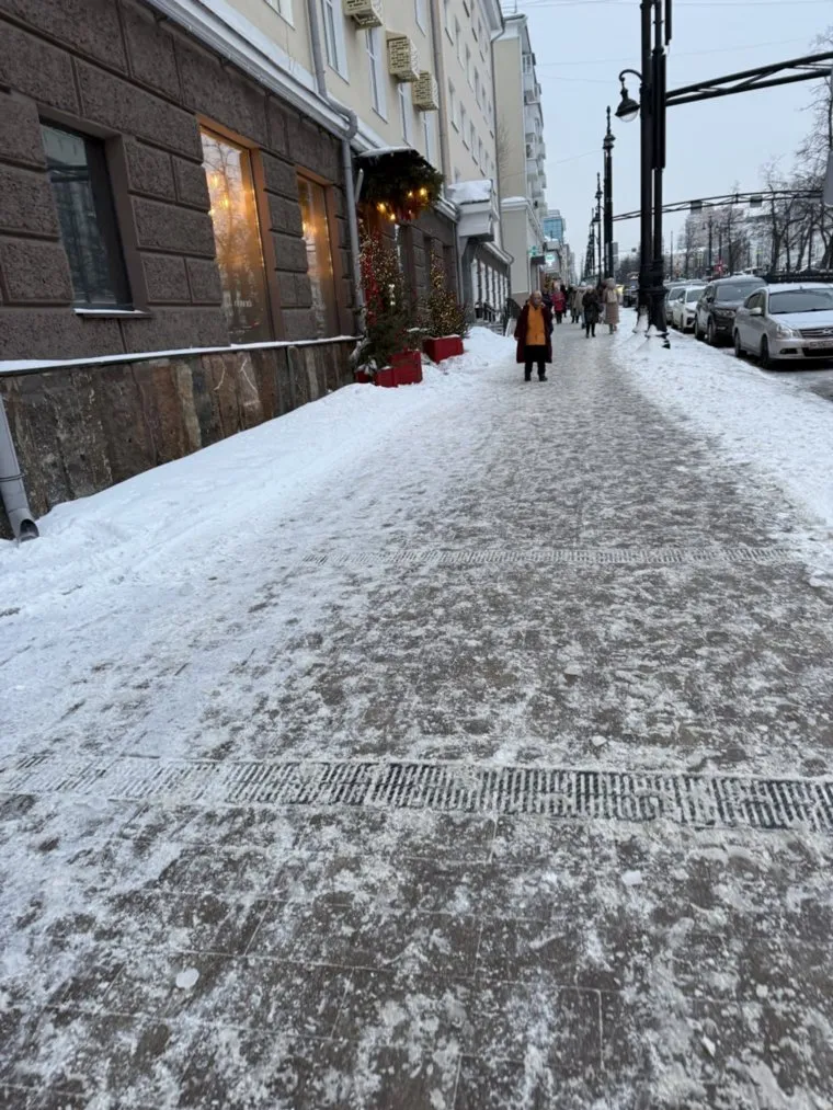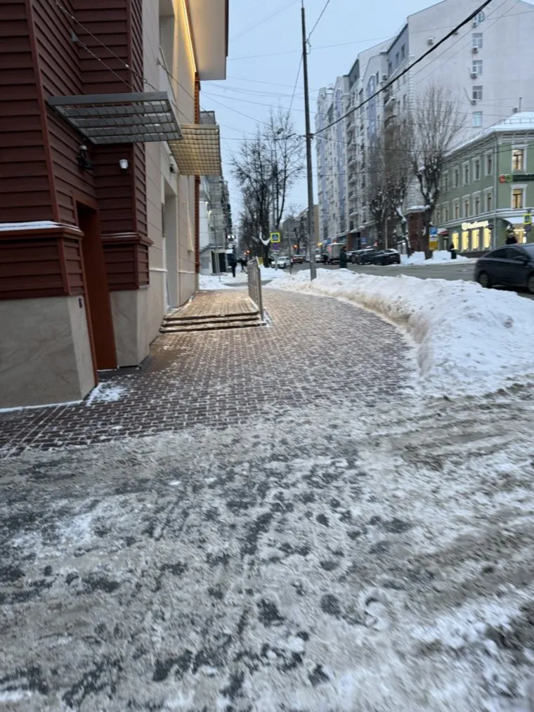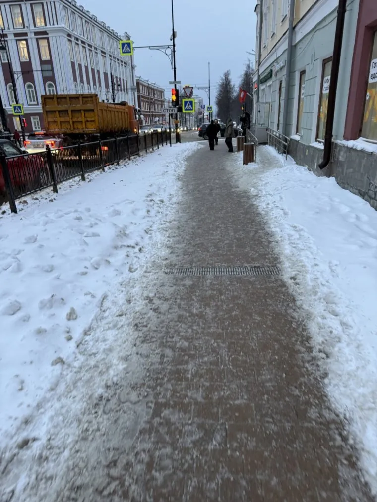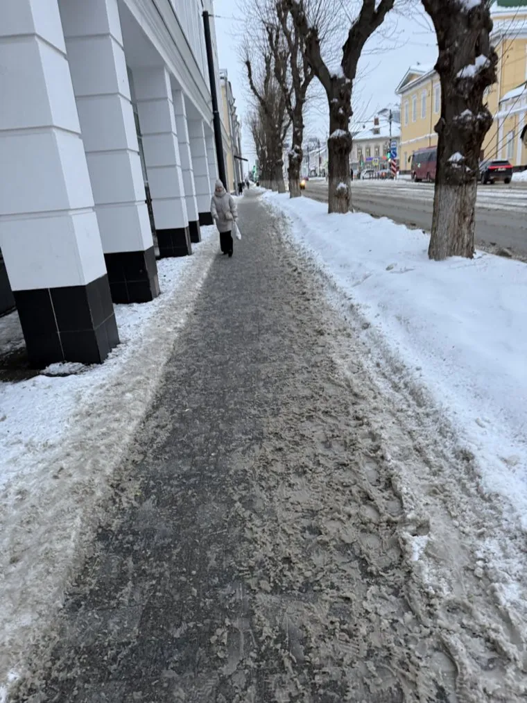 У администрации города тротуары чистые, но идти по ним сложно из-за гололеда