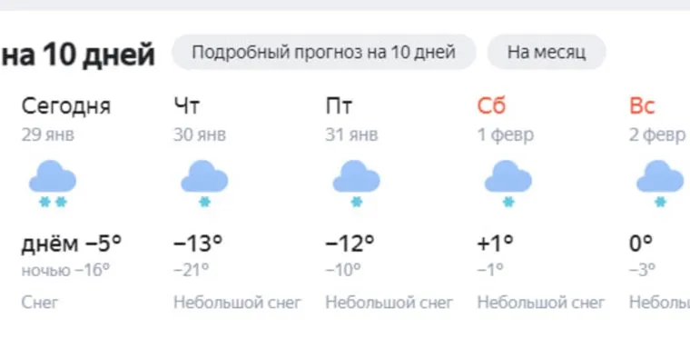 «Согласно прогнозам, 30 и 31 января будет морозно: днем температура составит 15-14 градусов нижу нуля, а ночью достигнет -25. Однако уже в субботу, 1 февраля, на фоне снега воздух прогреется до +1 градуса днем и минус 1- минус 3 ночью. Ветер в эти дни будет достигать до 4 м/с», — следует из данных сервиса курганского ЦГМС и «Яндекс. Погоды». Теплая погода продержится в регионе до 4 февраля.