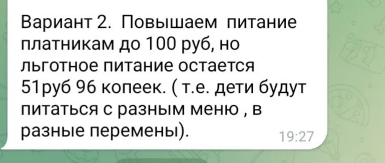«В родительских чатах Лесниковского лицея проводится опрос по поводу повышения стоимости обедов для школьников с 51,9 до 100 рублей. Сначала хотели брать доплату со всех, но с льготников брать деньги за питание нельзя. Поэтому в опросе предложили два варианта: оставить стоимость обедов на уровне 52 рублей для всех учеников, но из обеда убрать белковую составляющую (котлеты, мясо), либо повысить стоимость обедов до 100 рублей, а льготников кормить по другому меню (гарнир + чай) и в другую перемену. Меня возмущает, почему не повышают расходы на школьное питание для льготников из бюджета, и никто за это не борется?», — рассказала мама одного из учеников.
