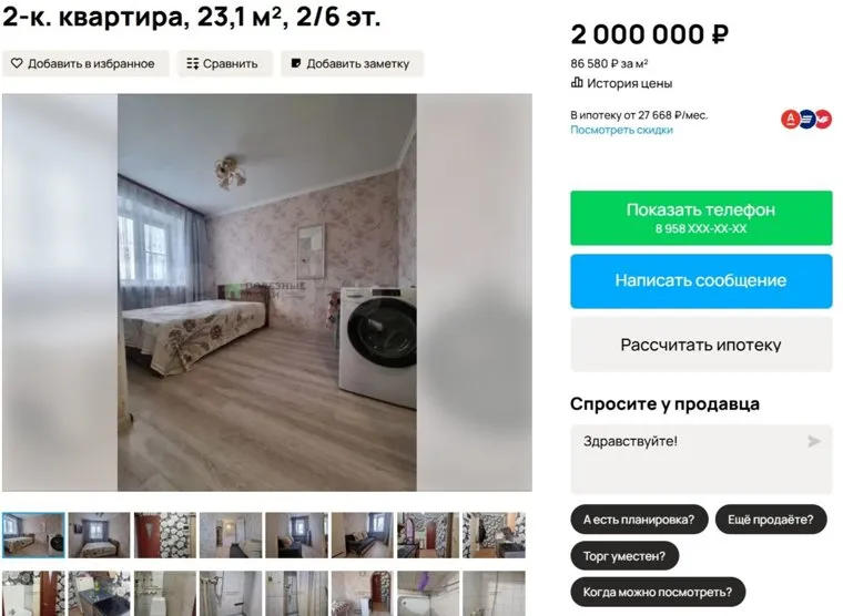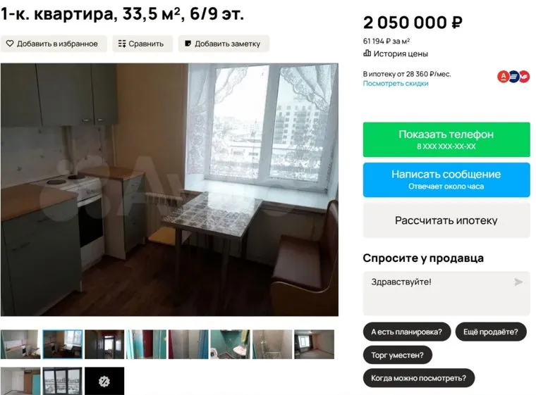 «Однокомнатная квартира площадью 33,5 квадрата на шестом этаже девятиэтажного дома продается на бульваре Солнечном, дом 5. Квартира теплая, готова к ремонту, стены ровные, стеклопакеты, перепланировок не было», — указано в описании жилья на популярном сайте. Владелец указал в объявлении цену 2050 000 рублей.