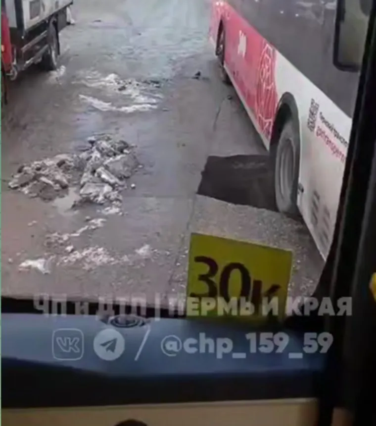 Автобус провалился в дыру на дороге и перекрыл движение в центре Перми. Фото