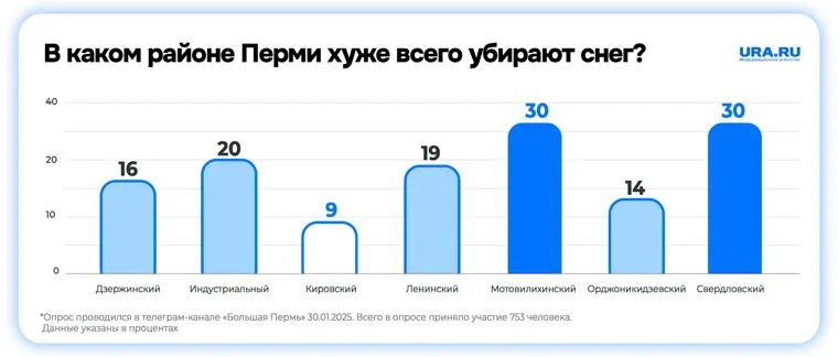 «Лидерами среди районов с плохой уборкой по мнению пермяков стали Мотовилихинский и Свердловский. Всего в опросе приняло участие 753 человека», — говорится в результатах опросах.