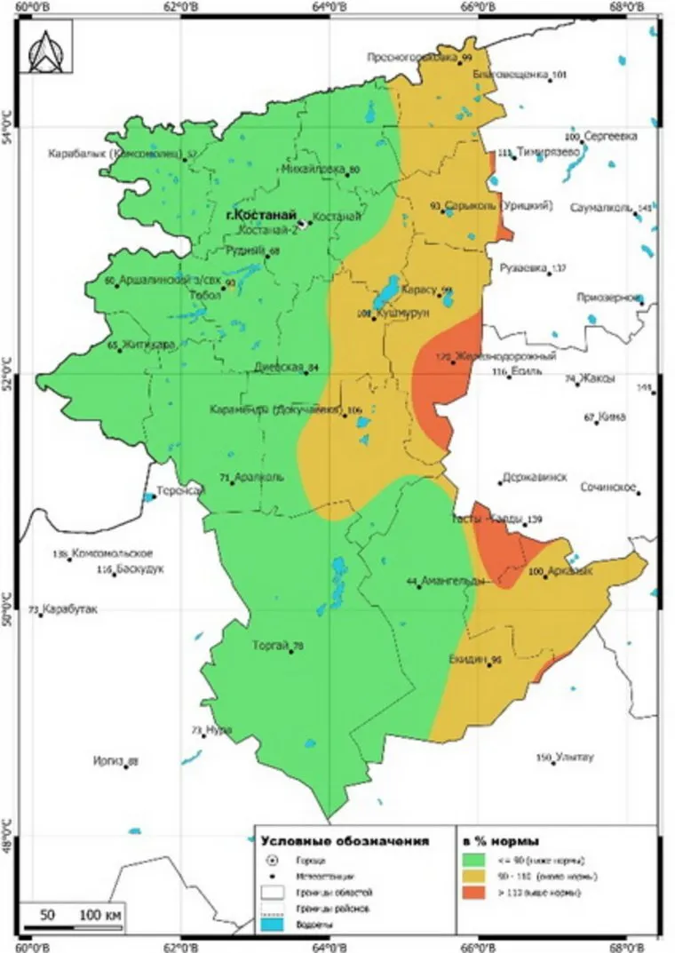 Отмечается, что на севере Костанайской области сумма накопленных осадков (снегонакопление) в среднем на 21% ниже нормы. Кроме того, осеннее увлажнение оказалось меньше нормы в среднем от 40 до 64%.