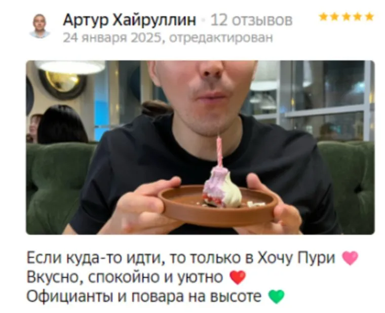 Полюбился вартовчанам и ресторан грузинской кухни «Хочу Пури» (4, 7), который открылся весной 2024 года. Клиенты отмечают слаженную работу персонала и быструю рассадку за столики даже во время праздников. «Когда я сама работала в общепите, было сложно держать улыбку всю смену. А тут чувствуется искренность», — призналась Илона. Гостей-именинников также радуют десерты, которые подают в ресторане честь дня рождения. Однако, похоже, презент достался не всем... «Пришла отпраздновать день рождения, обещали поздравление и скидку. Заполнила анкету, но в итоге на меня забили. Сделали скидку, когда я напомнила, но подарка от заведения все равно не было», — расстроилась Вероника. Администраторы между тем пообещали ей разобраться в ситуации.