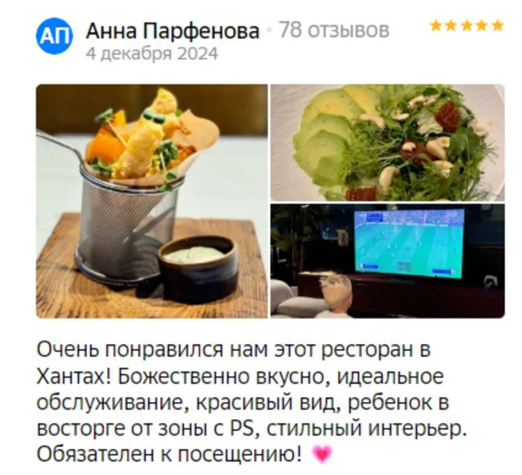 Еще одно любимое гастроместо у хантымансийцев — Bro Restobar с оценкой 4, 6. Ресторан обновил интерьер и концепцию меню в 2023 году. В заведении подают стейки, салаты, бургеры, авторские коктейли. «В наличии есть даже вегетарианский бургер. Хочу отметить оформление ресторана, красивый вид на город. Однако рекомендую установить на столах кнопки вызова официанта», — посоветовала Любовь. На отзывы ориентируется и те, кто оказались в Ханты-Мансийске проездом. «Благодаря отзывам посетили данное заведение. Понравился интерьер и еда», — пишет Юлия.