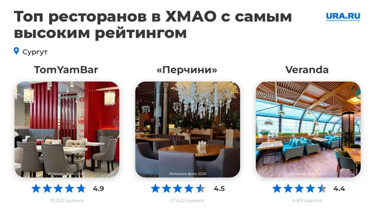 Для сытного обеда, ужина в кругу семьи, романтического вечера или другого торжества югорчане предпочитают как проверенные рестораны, так и новые точки. При выборе заведения клиенты часто ориентируются и на оценки с отзывами гостей — как правило их оставляют на портале 2ГИС. URA.RU изучило любимые гастроместа югорских гурманов и составило список заведений общепита с самым высоким рейтингом в ХМАО.