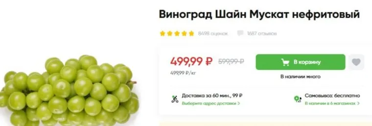 «Виноград Шайн Мускат нефритовый. 599 рублей за килограмм без скидки», — следует из описания товара. В других крупных маркетах в округе такой сорт винограда уже раскупили, а новых поставок еще не было.