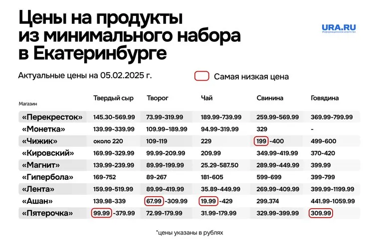 В конце января в Свердловской области подорожали чай, свинина, говядина, творог и твердый сыр — продукты из минимального набора. Корреспондент URA.RU сходил в популярные сетевые супермаркеты Екатеринбурга, чтобы выяснить, сколько реально стоят товары и где они дешевле.