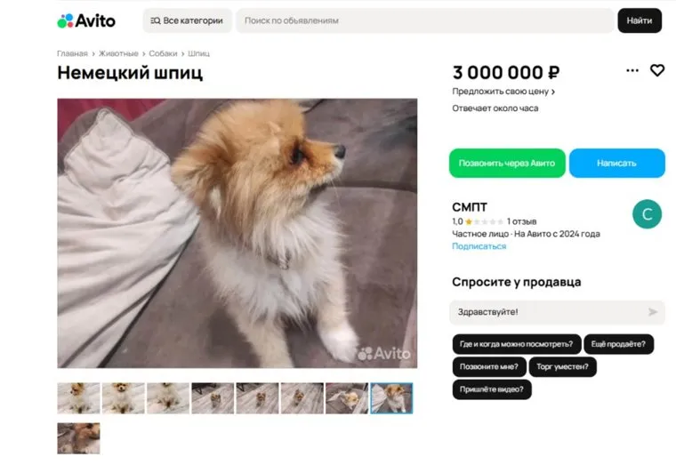 «Продается немецкий шпиц. Цена — три миллиона рублей», — говорится на сайте «Авито».