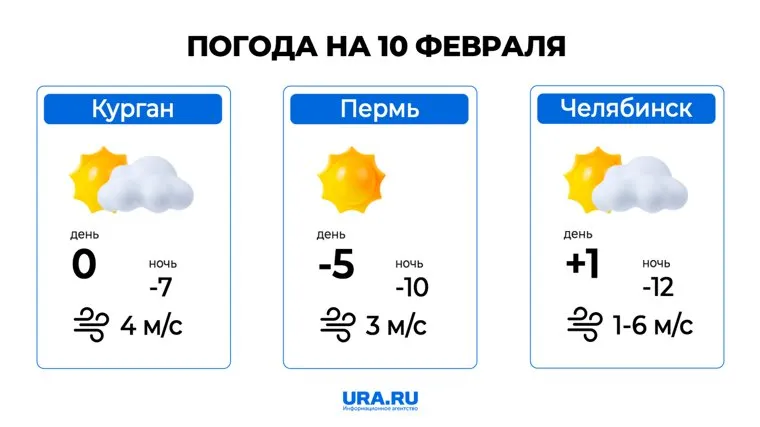 Уральская столица встретит 10 февраля с дневной температурой от минус 3 до 2 градусов выше нуля и ночной до минус 12. Ветер северо-западный, от 4 до 9 метров в секунду.