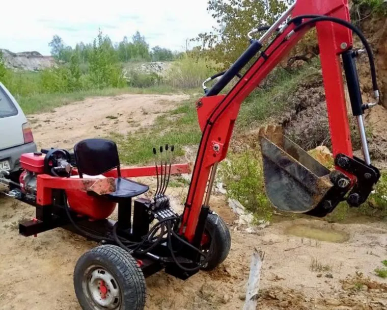 Экскаватор выполнен в виде прицепа к автомобилю. Он отличается компактностью, мобильностью и высокой эффективностью в использовании. Техника нужна для копки окопов и укрытий.