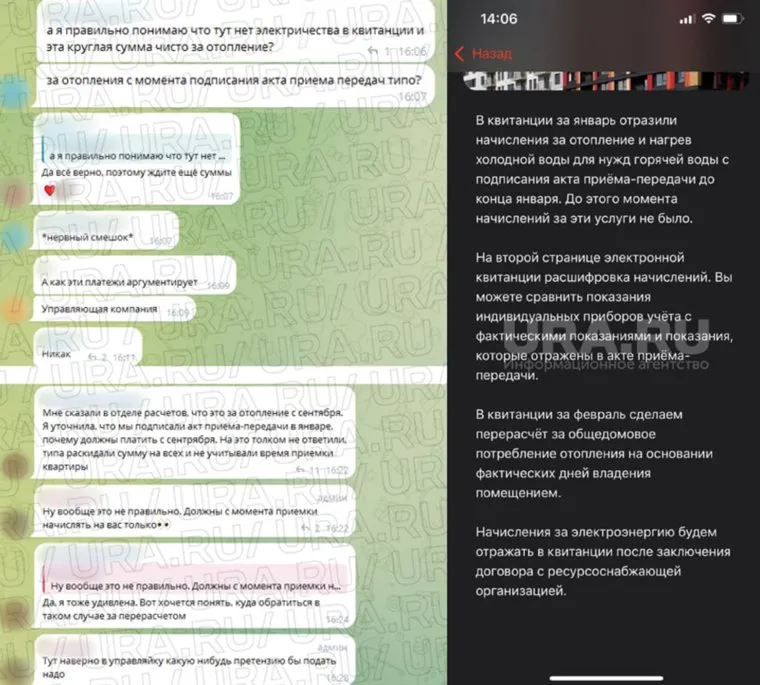 В пресс-службе «Брусники» URA.RU пояснили, что всю сумму не обязательно оплачивать сразу и можно разделить на несколько платежей. «Цифры в квитанциях — не плата за предыдущий месяц, а перерасчет за все время эксплуатации дома. Большинство квартир сдавались в конце прошлого лета, и с тех пор жители не платили за отопление и горячее водоснабжение. Сейчас управляющая компания заключает договоры с ресурсоснабжающими организациями и выставляет счета за прошедшие периоды. УК остается на связи с жителями. В приложении мы пояснили, как сформировалась сумма в квитанции за январь, и предупредили, что в феврале будет произведён перерасчет за общедомовое потребление отопления».