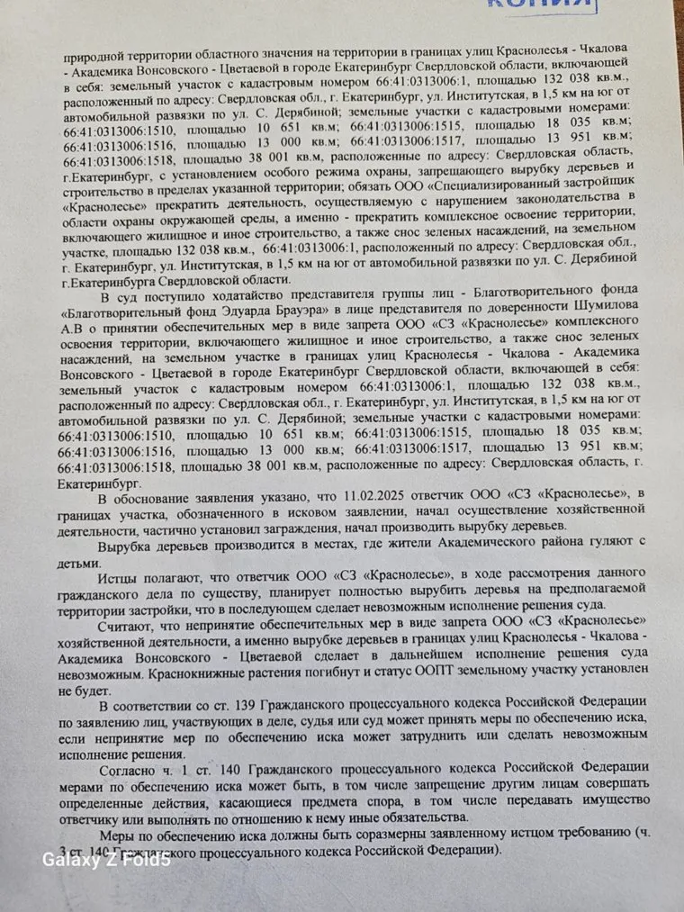 16:27 »[…] с установлением особого режима охраны, запрещающего вырубку деревьев и строительство в пределах указанной территории; обязать ООО «Специализированный застройщик «Краснолесье» прекратить деятельность, осуществляемую с нарушением законодательства в области охраны окружающей среды, а именно — прекратить комплексное освоение территории, включающего жилищное и иное строительство, а также снос зеленых насаждений, на земельном участке, расположенный по адресу: […] ул. Институтская, в 1,5 км на юг от автомобильном развязки по ул. С. Дерябиной», — говорится в документе.