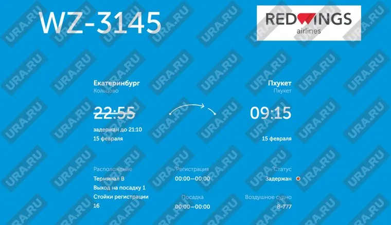 В аэропорту Кольцово задержали рейс до Пхукета (Тайланд) авиакомпаниии Red Wings на сутки. Ожидают его более 400 пассажиров, рассказал читатель URA.RU Сергей С.