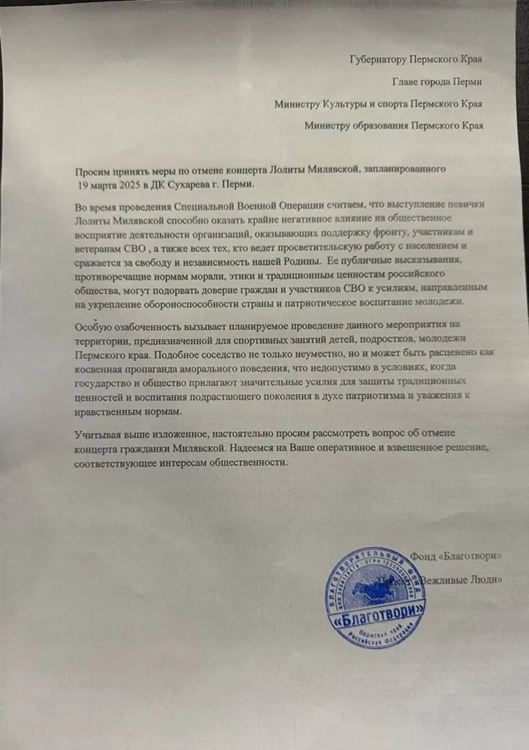 «Особую озабоченность вызывает планируемое проведение концерта на территории, предназначенной для спортивных молодежи Пермского края. Подобное соседство может быть расценено как косвенная пропаганда аморального поведения. Просим рассмотреть вопрос об отмене концерта Милявской», — сообщается на странице Гуманитарного Центра Прикамья в соцсети «ВКонтакте».