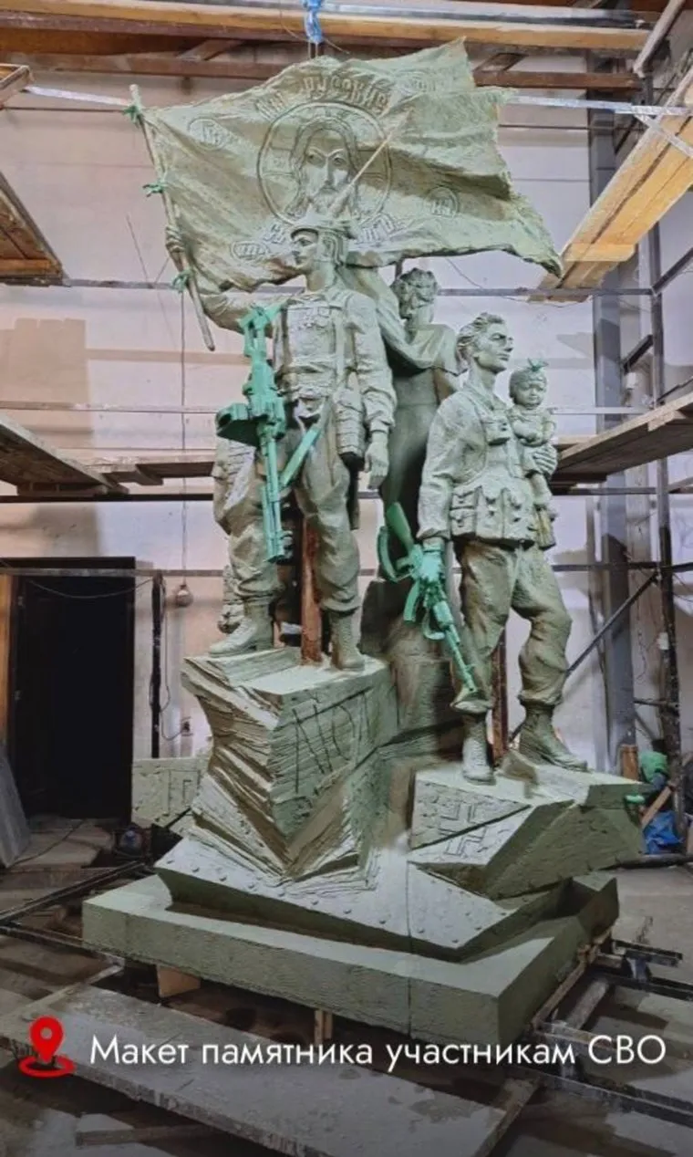 Речь идет о памятнике, автором которого стал скульптор Алексей Залазаев. Общая высота композиции составит 7,2 метра. Она состоит из нескольких фигур, а главная представляет собой воина-знаменосца с флагом Христа с текстом «Мы русские, с нами бог».