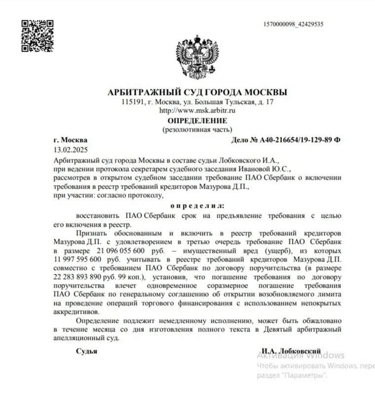 «Признать обоснованным и включить в реестр требований кредиторов Мазурова Д.П. с удовлетворением в третью очередь требование ПАО Сбербанк в размере 21 096 055 600 рублей — имущественный вред (ущерб)» — сообщается в документе на сайте суда. Определение вынесено 13 февраля 2025 года.