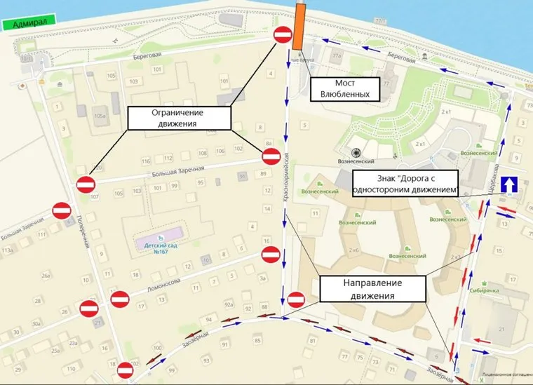 «На участках улиц Красноармейской и Щербакова от Заозерной до Береговой, а также на участке улиц Береговой от Щербакова до Красноармейской движение будет односторонним. На участке улицы Поперечной от улицы Заозерной до Береговой движение будет ограничено», — рассказали в ведомстве.