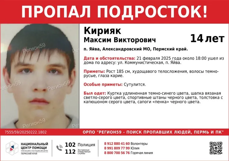 «Устанавливается местонахождения Максима Кирияка, 14 лет. Он 21 февраля 2025 года около 18:00 ушел из дома по улице Коммунистической в поселке Яйва. С тех пор его местонахождение неизвестно», — написано в telegram-канале поисковиков.