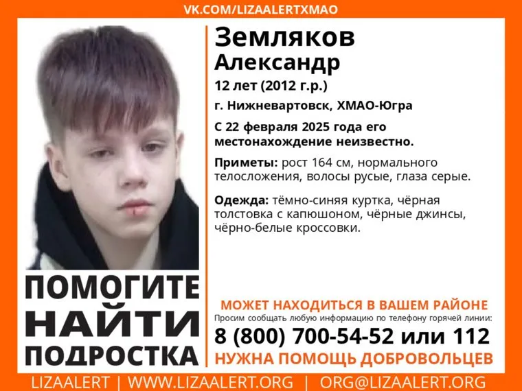 «Земляков Александр, 12 лет, г. Нижневартовск, ХМАО-Югра. С 22 февраля 2025 года его местонахождение неизвестно», — сообщается на сайте волонтеров.