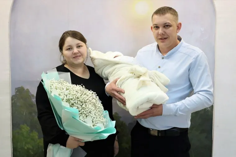 Супруги Тюлюбаевы с дочкой на выписке из перинатального центра