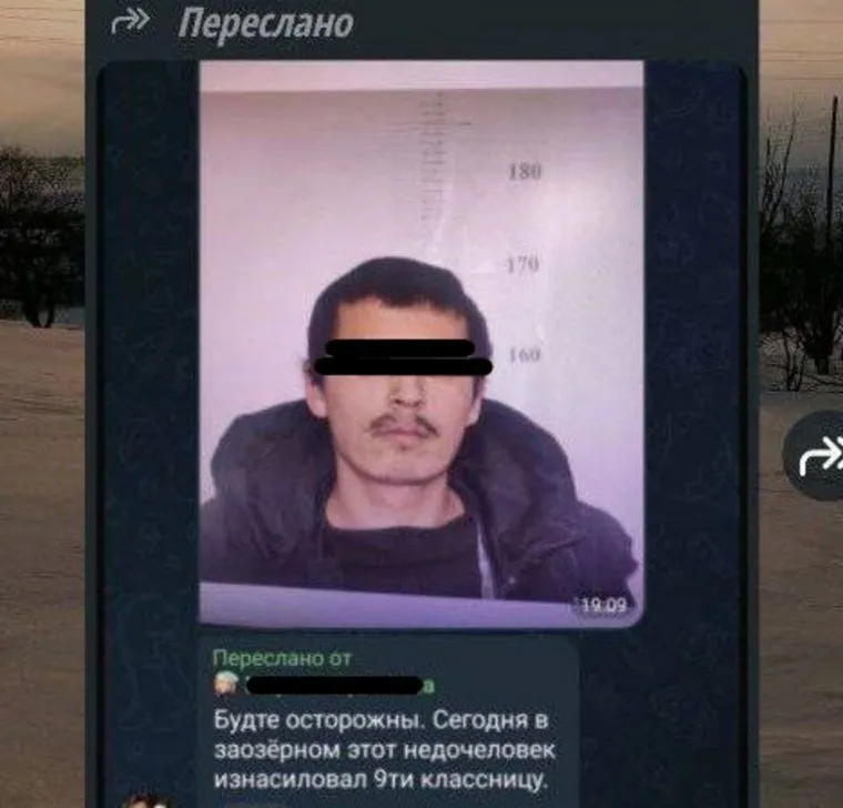 «Будьте осторожны. Сегодня этот недочеловек в Заозерном изнасиловал девятиклассницу», — пишут горожане в чатах. Информацию из чатов редакции предоставил читатель, пожелавший остаться неизвестным.