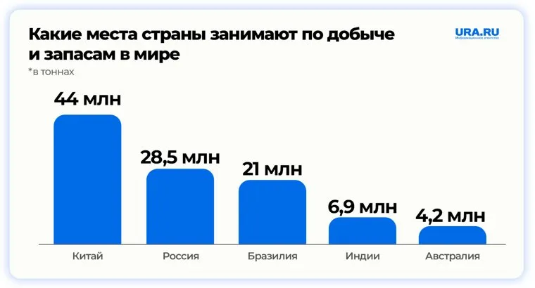Лидером по запасам редкоземельных металлов является Китай, где сосредоточено 44 миллиона тонн. На втором месте находится Россия с 28,5 миллиона тонн. Третье занимает Бразилия с запасами в 21 миллион тонн. Индия и Австралия также входят в число крупнейших держателей редкоземельных ресурсов с запасами 6,9 и 4,2 миллиона тонн соответственно.