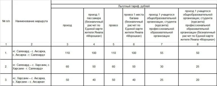 Также в Салехарде на межмуниципальном маршруте №502 Салехард — Аксарка действуют следующие тарифы и скидки по карте «Морошка»: